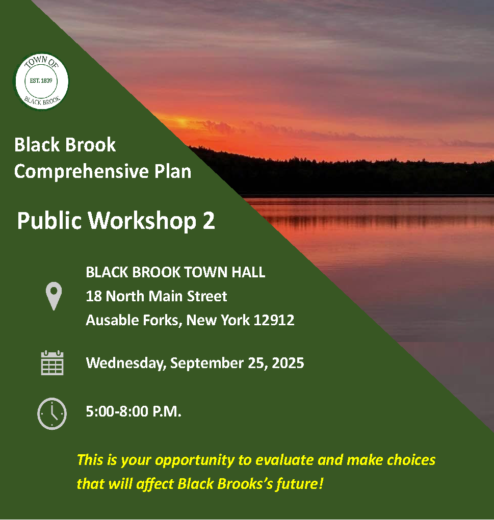 Welcome to the Town of Black Brook’s Comprehensive Plan project website. We are excited that you are here and interested in the future of the Town. This website is intended to provide information regarding the development of the Comprehensive Plan update and keep the community informed of opportunities to participate in the process.